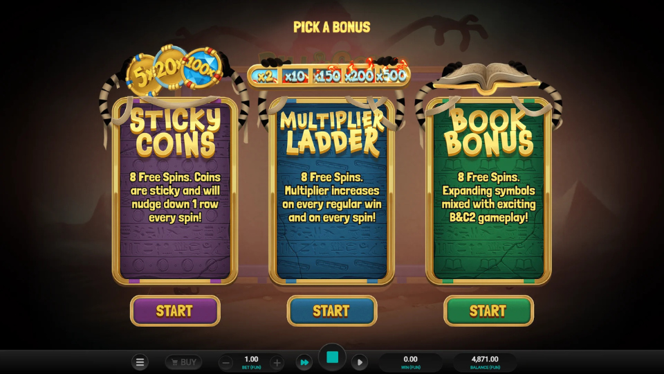 - Super Bonus: A mode that combines all three bonus modes (Sticky Coins, Multiplier Ladder, Book Bonus) into one single bonus feature, which can lead to substantial potential win.