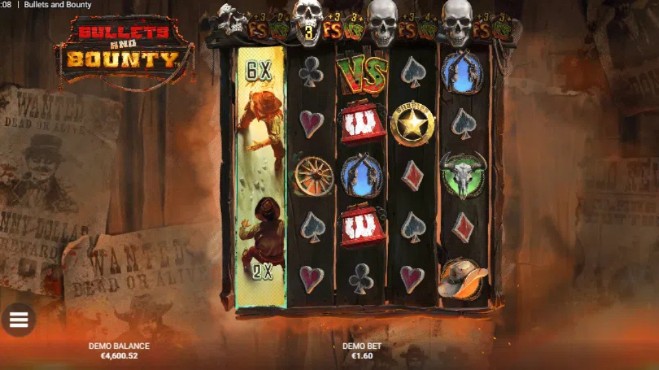 - Four Shots to Freedom Bonus: Triggered by 4 FS scatters, awarding 10 free spins plus the Bullets & Bounty Bar, which tracks Bounty Hunter wins. As you win duels, the bar levels up, unlocking DuelSpins and extra free spins, up to Level 4 with a DuelSpin offering up to 5 VS symbols.