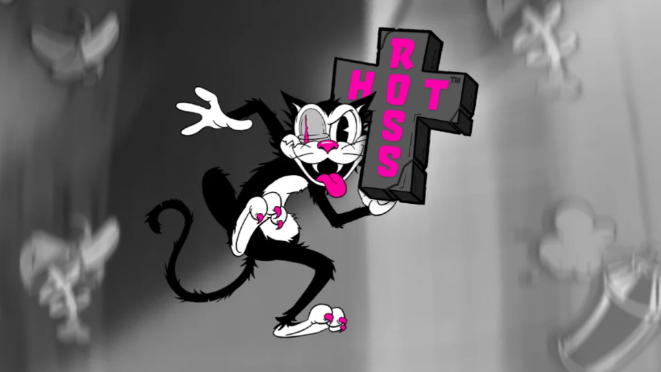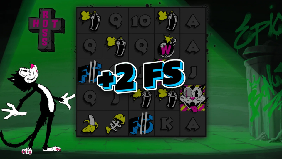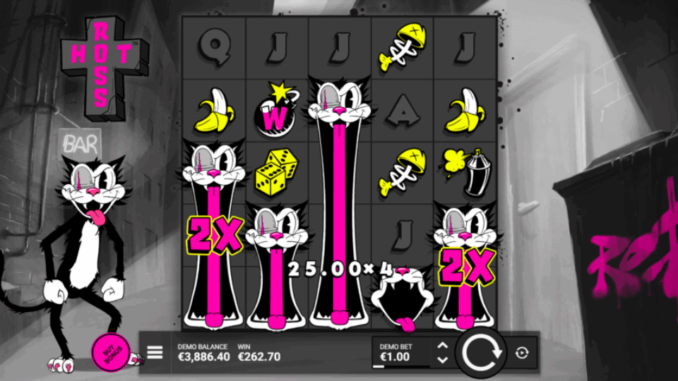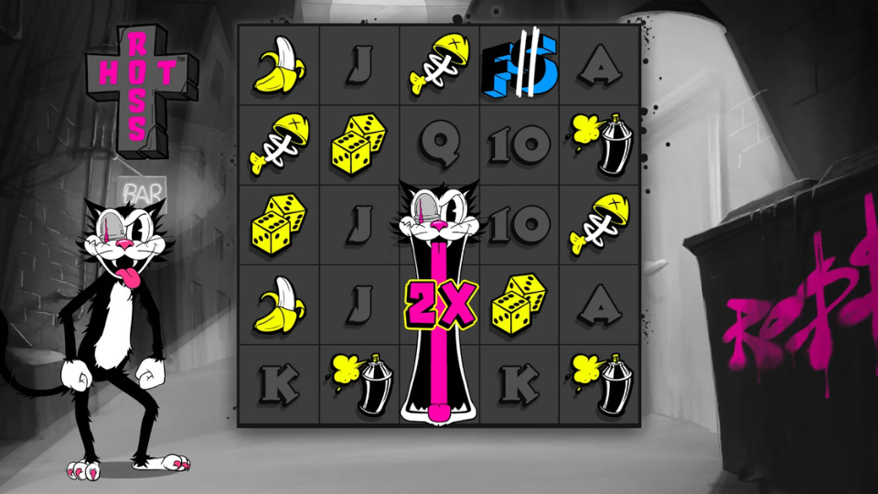 Hot Ross is a high volatility slot from Hacksaw Gaming, set in a gritty urban alleyway with a monochromatic, noir-inspired visual style accented by neon pink and yellow. The game features a cartoon feline protagonist named Ross and centers on a cat-and-mouse dynamic. Its core mechanics involve distinctive expanding wild symbols that can create chain reactions across the 5×5 grid.