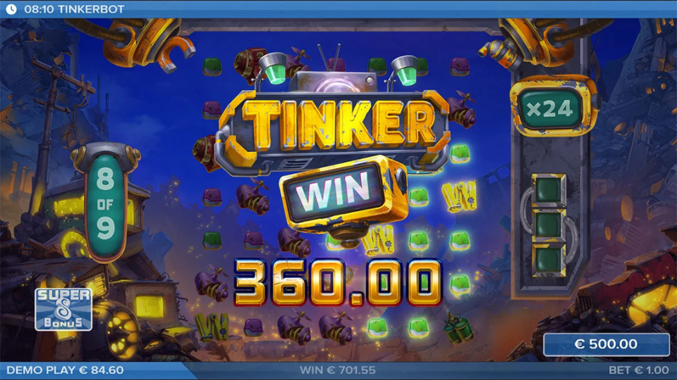 Tinkerbot by ELK Studios is a creative, fun-packed slot that brilliantly marries quirky design with innovative mechanics, making each spin a delightful adventure in a world of recycled treasures.