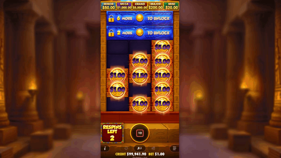 There is no feature buy or bonus buy option available in Tut’s Treasure Tower. Players must trigger the Lucky Respin Tower feature naturally through gameplay.