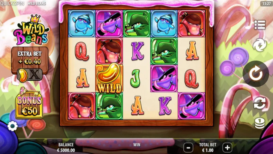 The visuals combine candy land whimsy with characterful beans, each with a unique style, set against a vibrant, lively soundtrack. Although the theme is sweet and playful, the variety of wild modifiers promises unexpected twists in how each spin plays out. It feels friendly and accessible, but with enough surprises to keep things interesting.